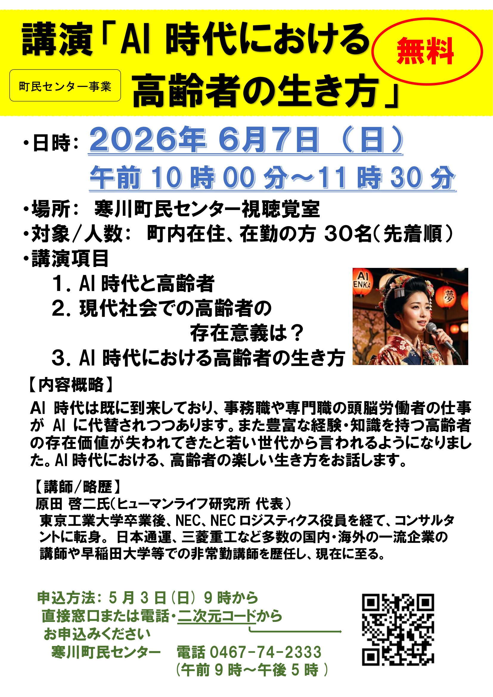 講演「AI 時代における高齢者の生き方」6月7日開催 先着順