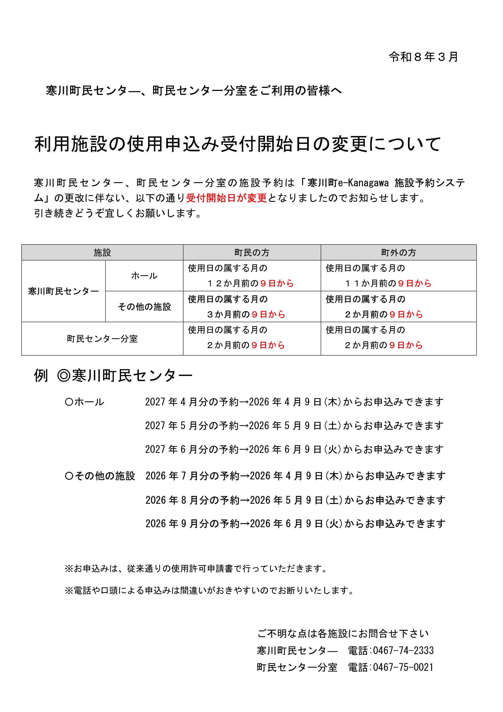 寒川町民センター、町民センター分室の施設予約は「寒川町e-Kanagawa 施設予約システム」の更改に伴ない、受付開始日が変更となりましたのでお知らせします。引き続きどうぞ宜しくお願いします。