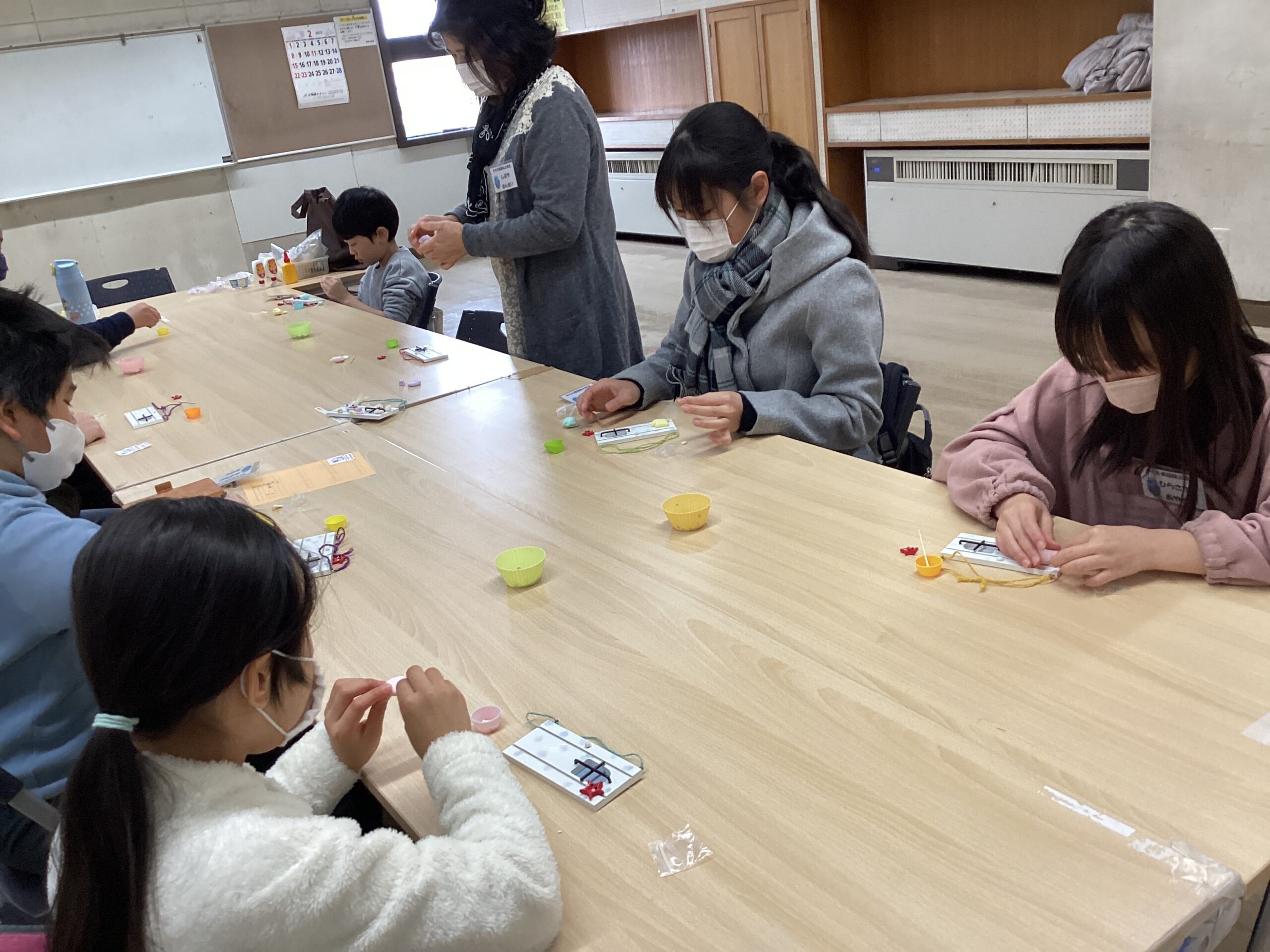 今回のテーマは、水族館。水族館にみたてた板の上に魚や貝殻などの海の生き物を貼り付けていきました。講師から自分なりの海の生き物を思い浮かべるようにとの話しもあり、参加者はオリジナリティに富んだ水族館を作っていました。